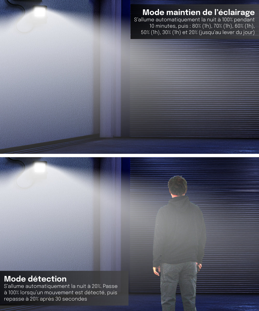 Le mode 2 repose sur une gestion intelligente de l’éclairage par détection. À la tombée de la nuit, le projecteur reste à 20% de sa puissance, maintenant une luminosité minimale. Dès qu'un mouvement est détecté, il passe immédiatement à 100% de luminosité, garantissant une visibilité maximale et un effet dissuasif contre les intrusions. Après 30 secondes sans détection, il revient à 20%, permettant une optimisation de l’énergie tout en assurant une longue autonomie.